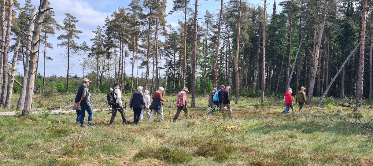 Kl. 08.00 stod 21 friske seniorer sammen med turlederen på P-pladsen i Ovstrup Hede. Mens der blev budt velkommen sang hedelærke med i koret af mange småfugle.