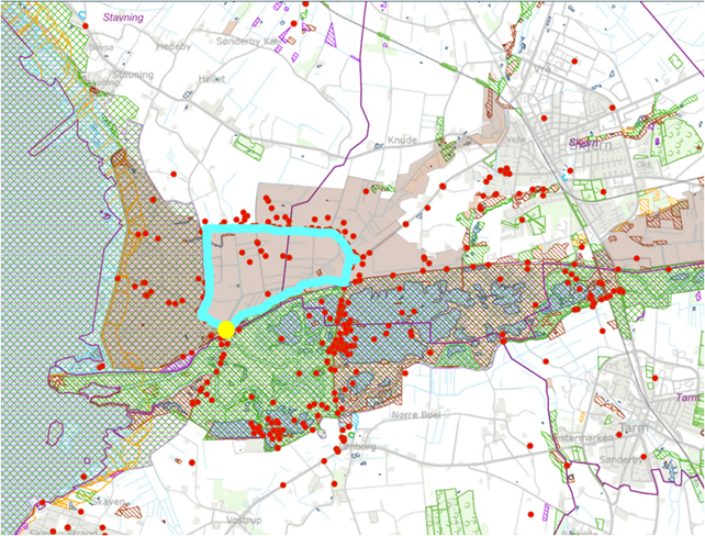 De skraverede områder på kortet er naturbeskyttede områder, herunder Natura 2000-områderne ved Skjern Å og Ringkøbing Fjord. Den lysebrune farve viser området for Naturstyrelsens store planlagte lavbundsprojekt. Den lilla linje er sognegrænsen mod Skjern. Pumpestation Nord er markeret med en gul prik.